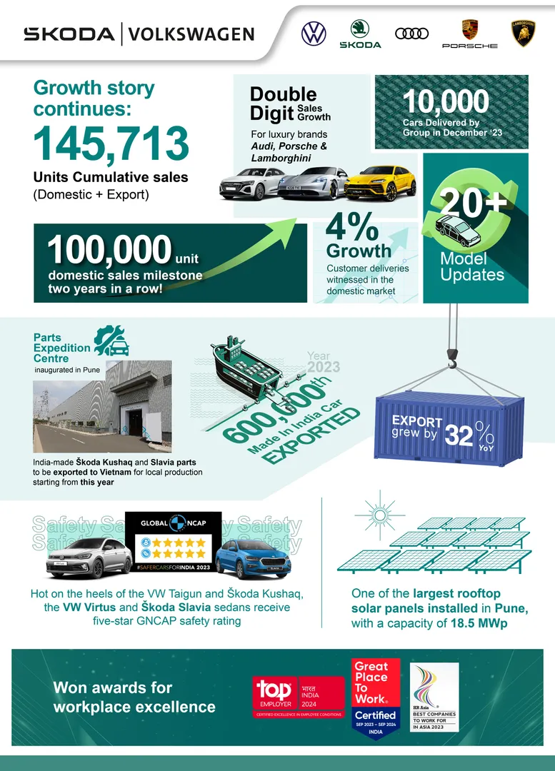 Mumbai / Pune, 08 January 2024 – As the calendar turns to 2024, Škoda Auto Volkswagen India Private Limited (SAVWIPL) fortifies its position in the Indian automotive sector, matching the record-breaking sales figures of 2022. The Group’s domestic sales stood impressively at 101,465 units, crossing the 100,000 units sales milestone for two consecutive years. Complementing this domestic success, export grew by 32% (year-on-year) with 44,248 units shipped from India, underlining SAVWIPL’s expanding global reach. Additionally, the Group’s overall customer deliveries witnessed a 4% growth in the domestic market, indicating a robust market presence and customer confidence in VW Group brand’s diverse offerings.