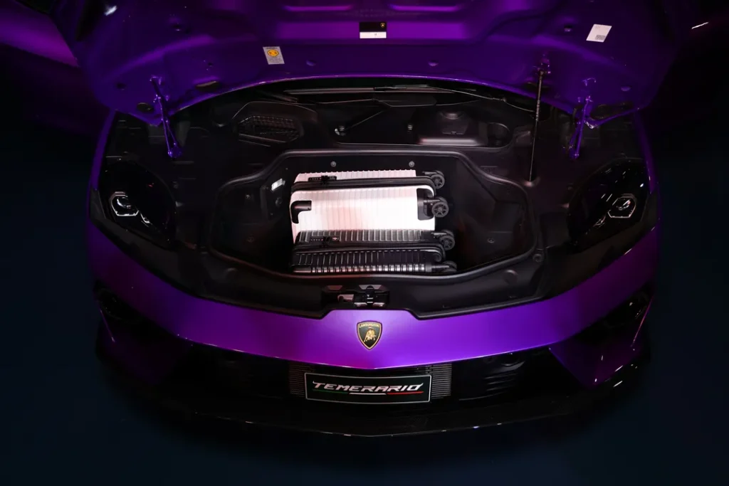 The Lamborghini Temerario is equipped with a lithium-ion high specific power (4500 W/kg) battery pack situated within the central tunnel, keeping the car’s center of gravity as low as possible and ensuring optimal weight distribution. The battery is protected by a lower structural layer and is connected to the front electric motors, the rear electric motor, and an integrated recharging unit.